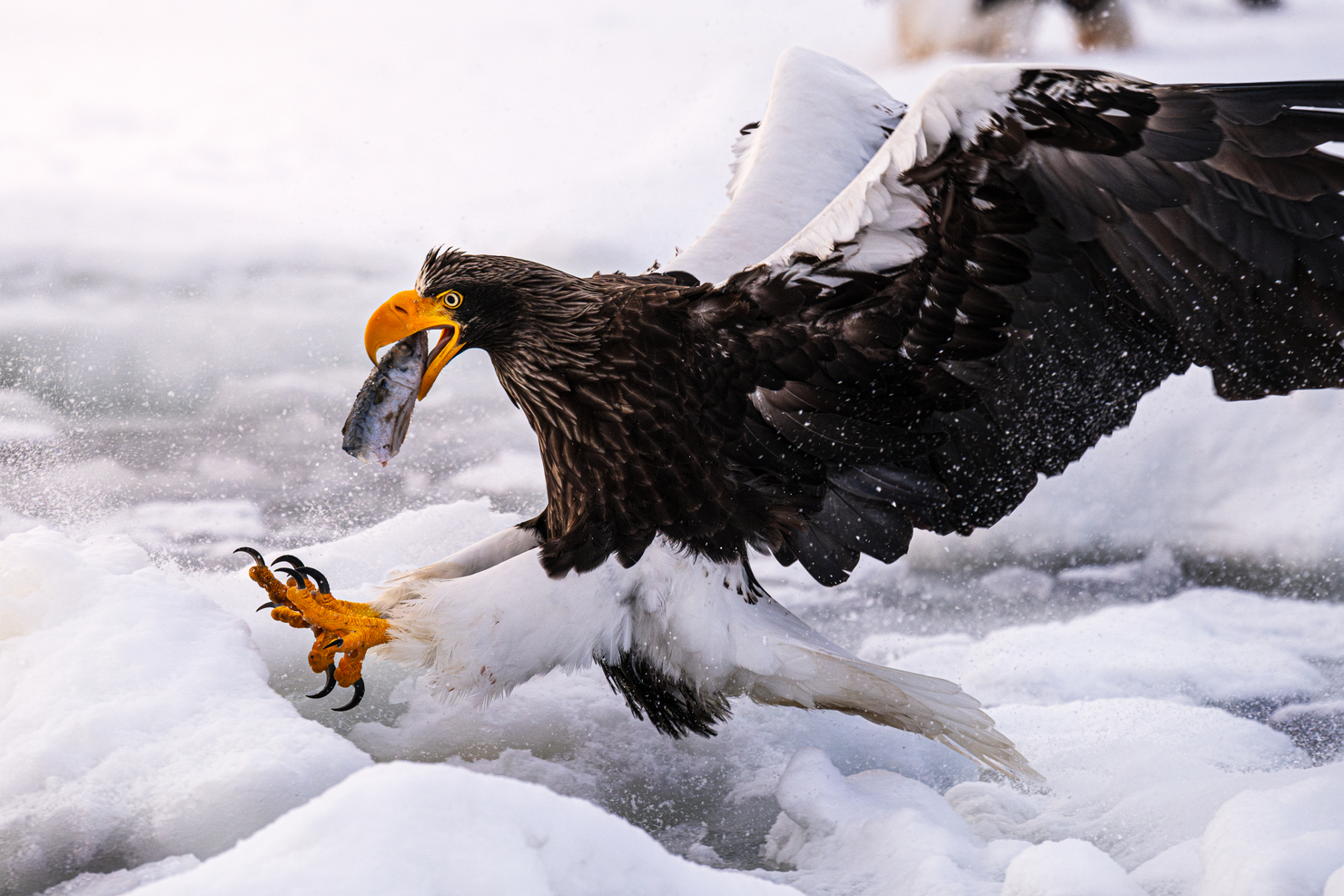雪の降る嵐山で、桂川を進む屋形船を撮影した。