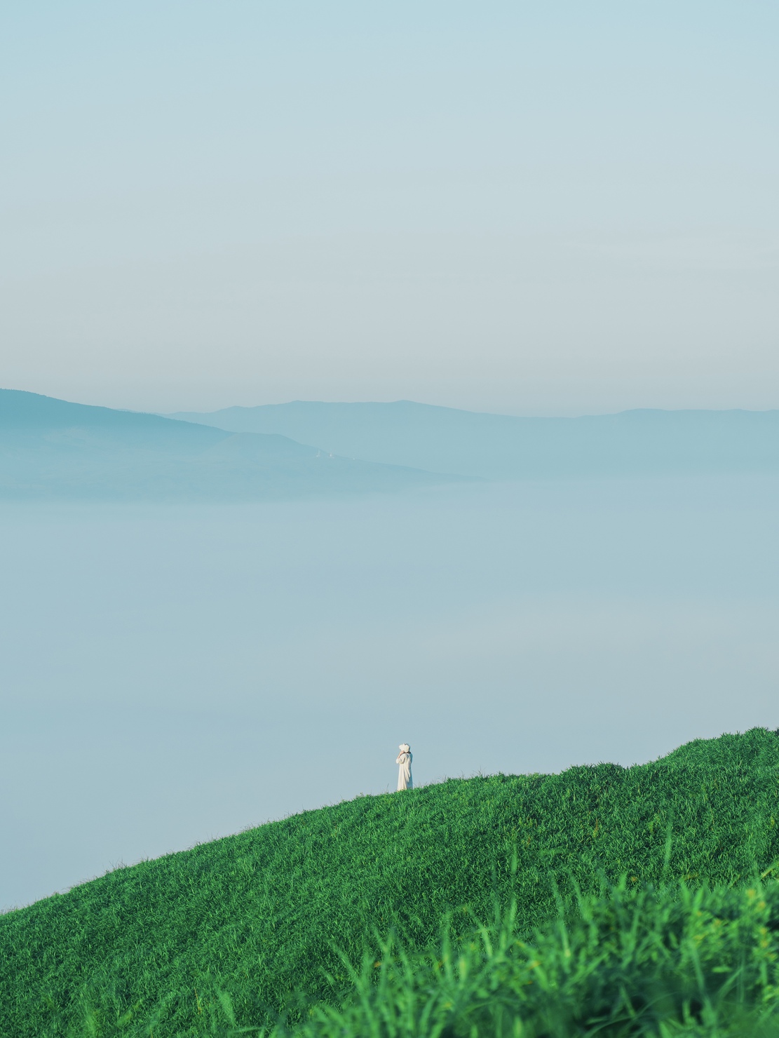 前日との寒暖差により見事な大雲海を見せる初夏の阿蘇. 広大な自然と稜線に立つ女性を見つけ、私は思わずシャッターを切った.日の暖かさを纏うその姿と朝の涼しさを感じさせる草原の対比は、まるで絵画のような場の静けさと感動を私に与えた.